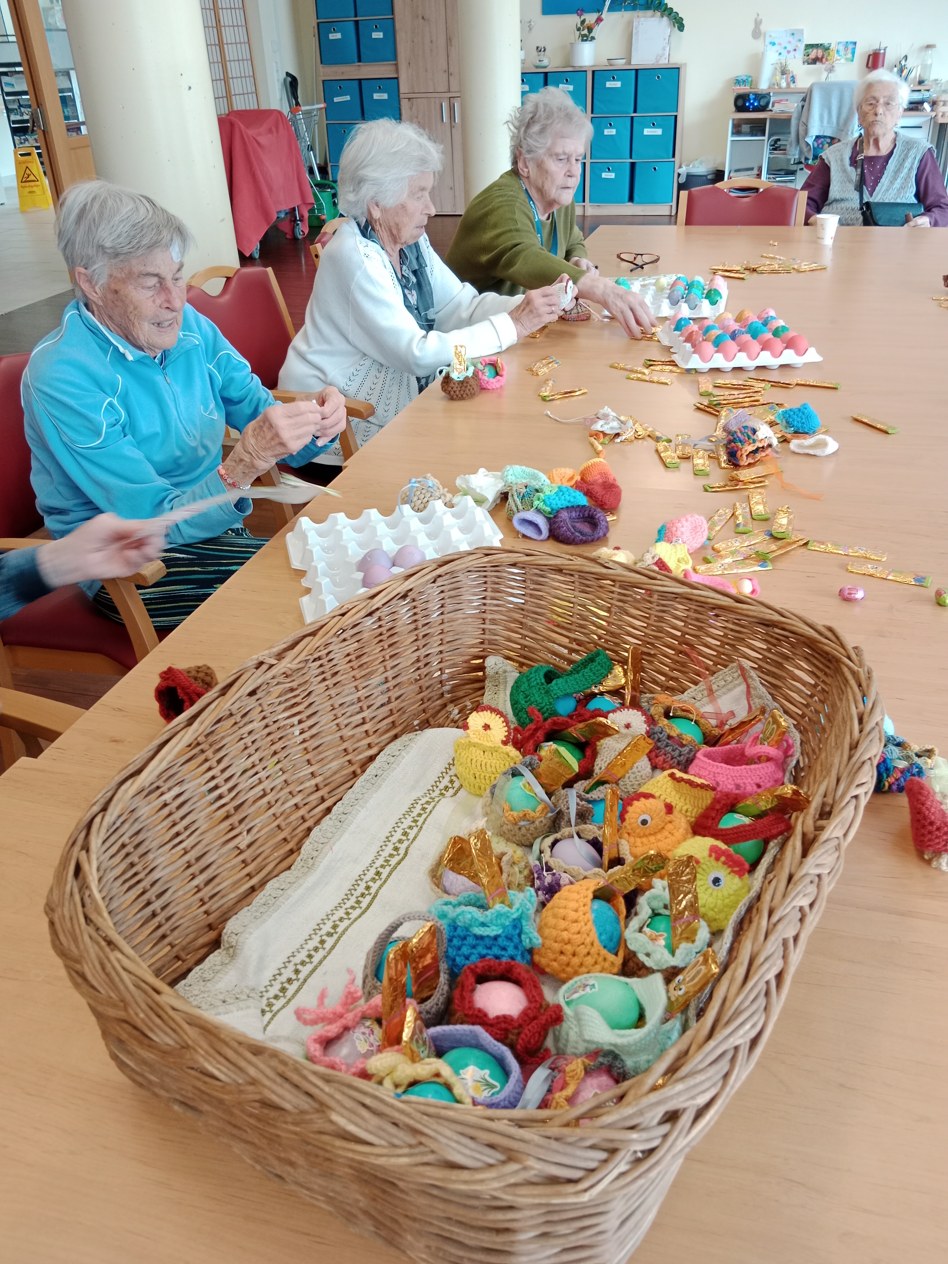 Ostern steht vor der Tür und zu diesem Anlass veranstaltet das SeneCura Sozialzentrum Afritz ein buntes Osterfest. Kein Wunder also, dass die Vorbereitungen auf Hochtouren laufen. Die Seniorinnen und Senioren freuen sich sichtlich darüber, dass sie dabei tatkräftig mitwirken dürfen. So dauerte es kürzlich auch nicht lange, bis beim gemeinsamen Ostereierfärben am Gründonnerstag ausgelassene Stimmung aufkam. Ostereier wurden dabei klassisch und mit Marmorierfarbe gefärbt sowie anschließend in liebevoll gehäkelten Osterkörbchen samt Schokoosterhasen gegeben.